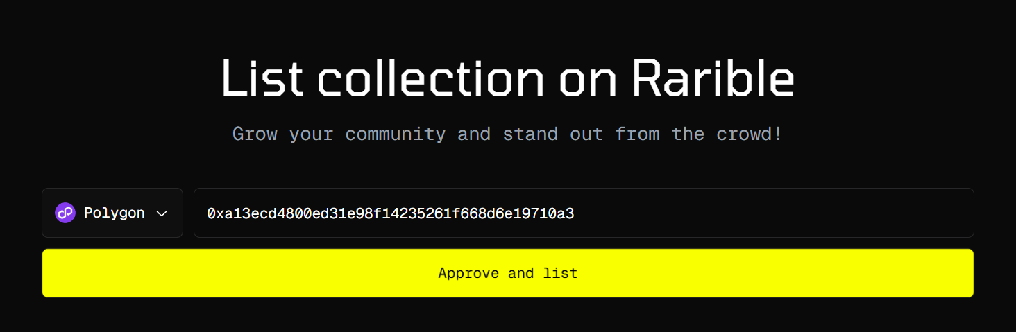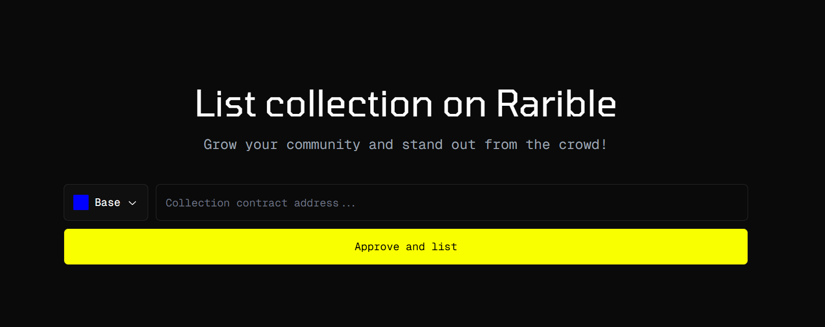 The core functionality here is to streamline the process of approving and listing an NFT collection, making it discoverable and tradable on Rarible's platform. This helps creators "grow their community and stand out from the crowd" by exposing their project to a broader audience of buyers, collectors, and enthusiasts.
