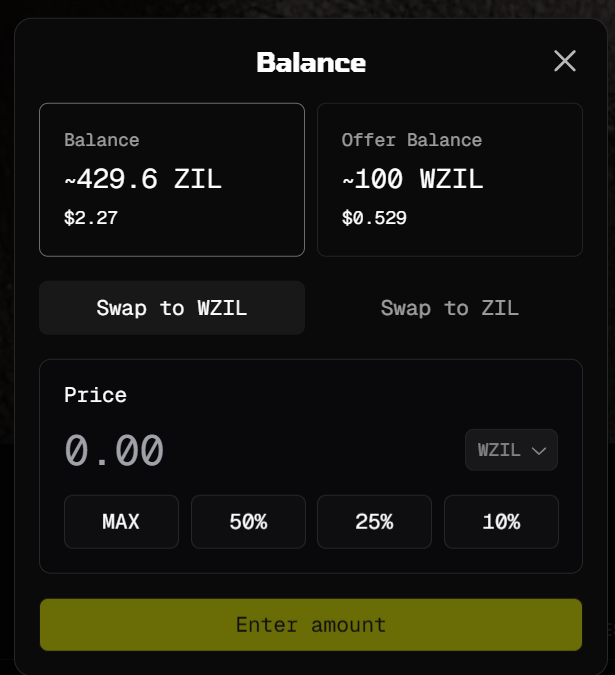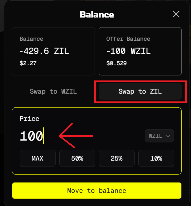- In the pop-up, switch to the “Swap to ZIL” tab (or the equivalent “Unwrap”/“Swap to native” tab for your chain).