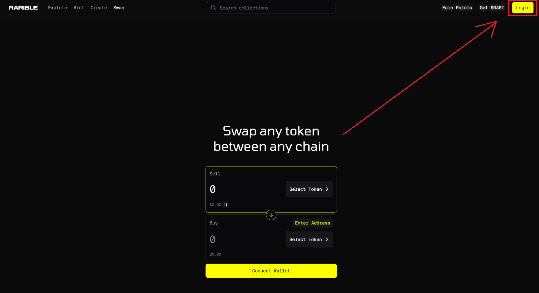Navigate to the Rarible Swap interface on rarible.com. In the top-right corner, click the Login button to connect your preferred wallet.