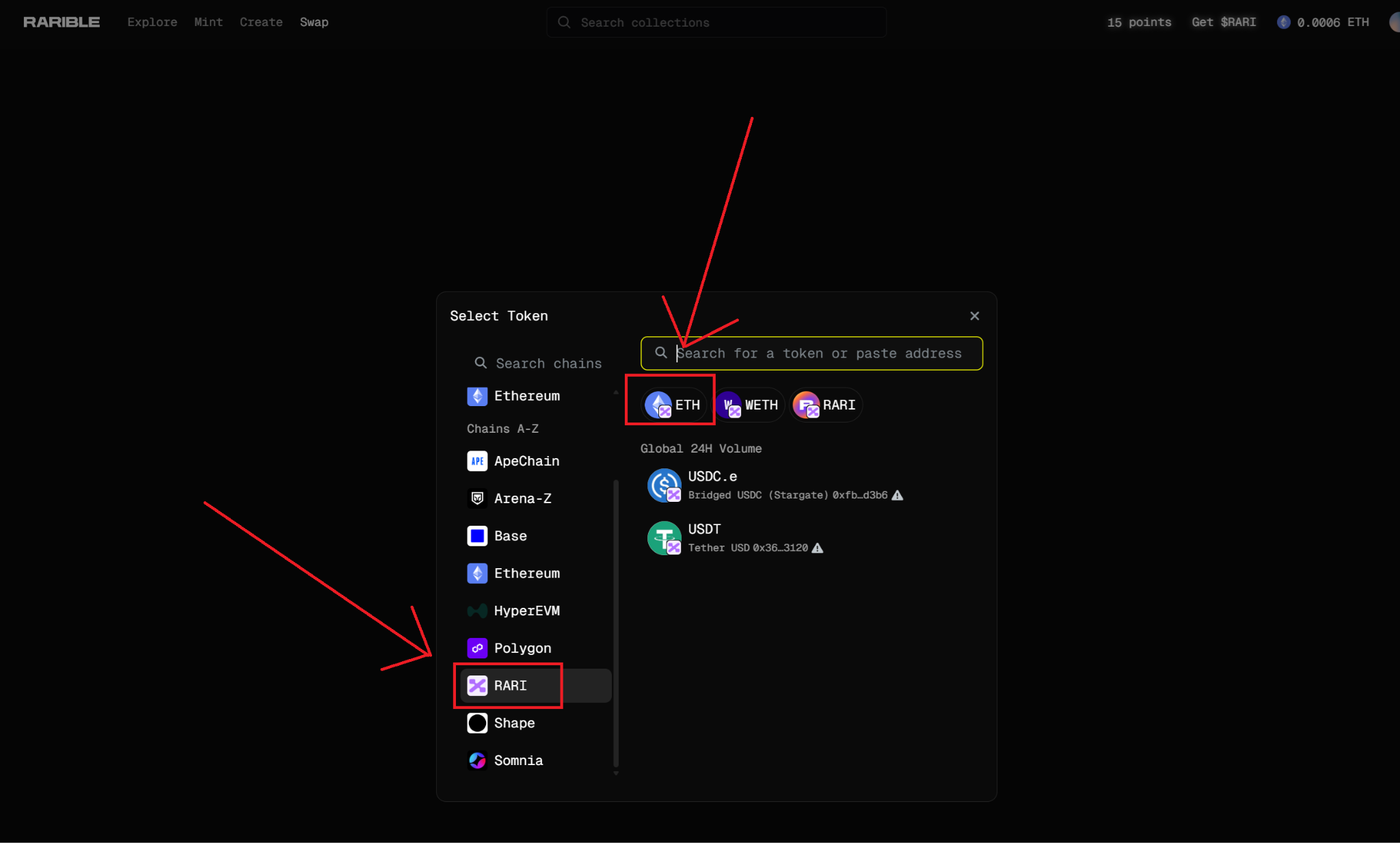 In the pop-up, choose the target blockchain and token. For this example, select the RARI Chain as the destination network (the token will typically remain ETH or its equivalent on the target chain).
